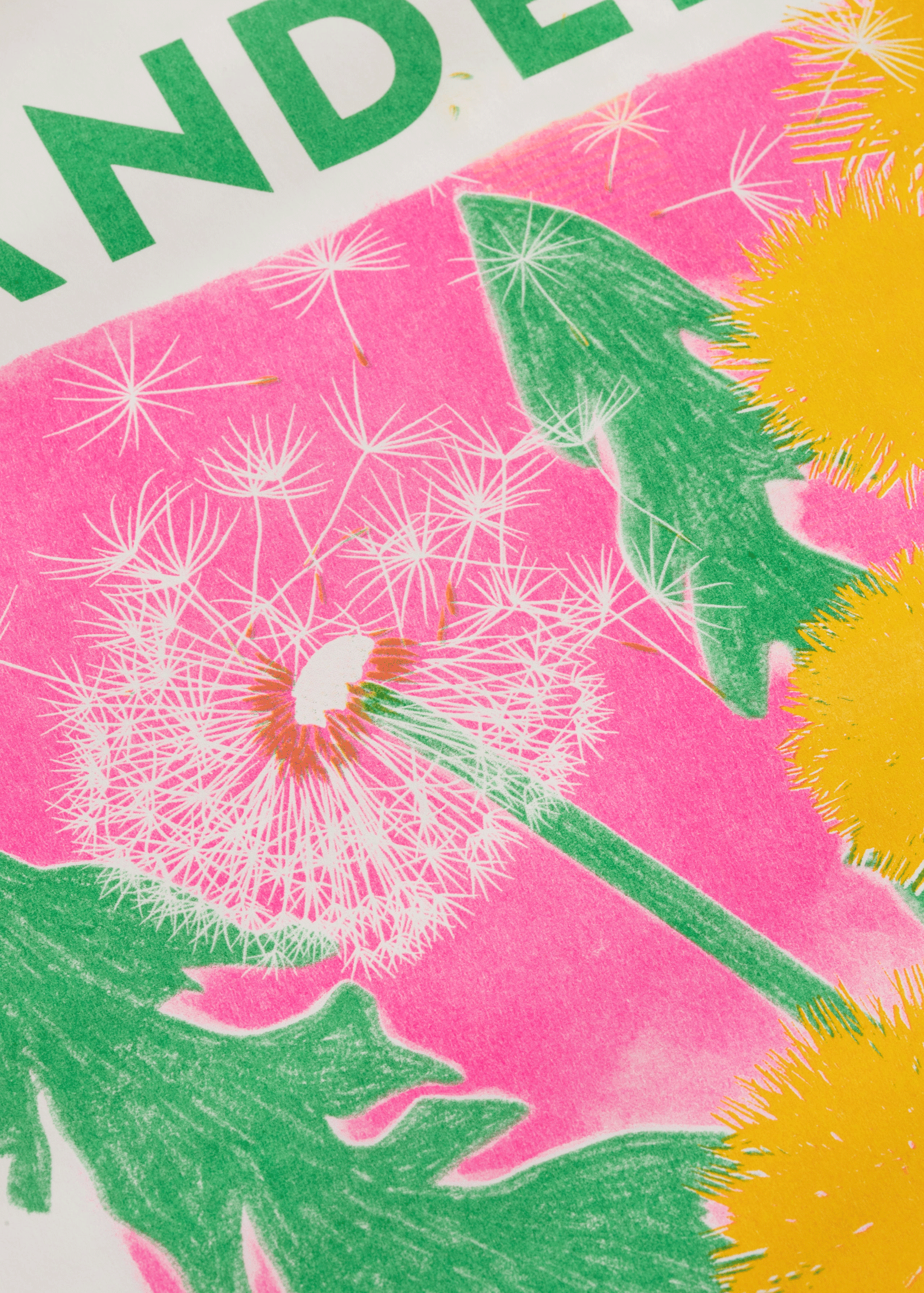 This Riso print was created for the Wild exhibition, for our friends at Manchester Museum. I wanted to capture the untamed nature of the dandelion, and also the playful childhood memory that lots of us have of making a wish, and telling the time by blowing on the Dandelion clocks.