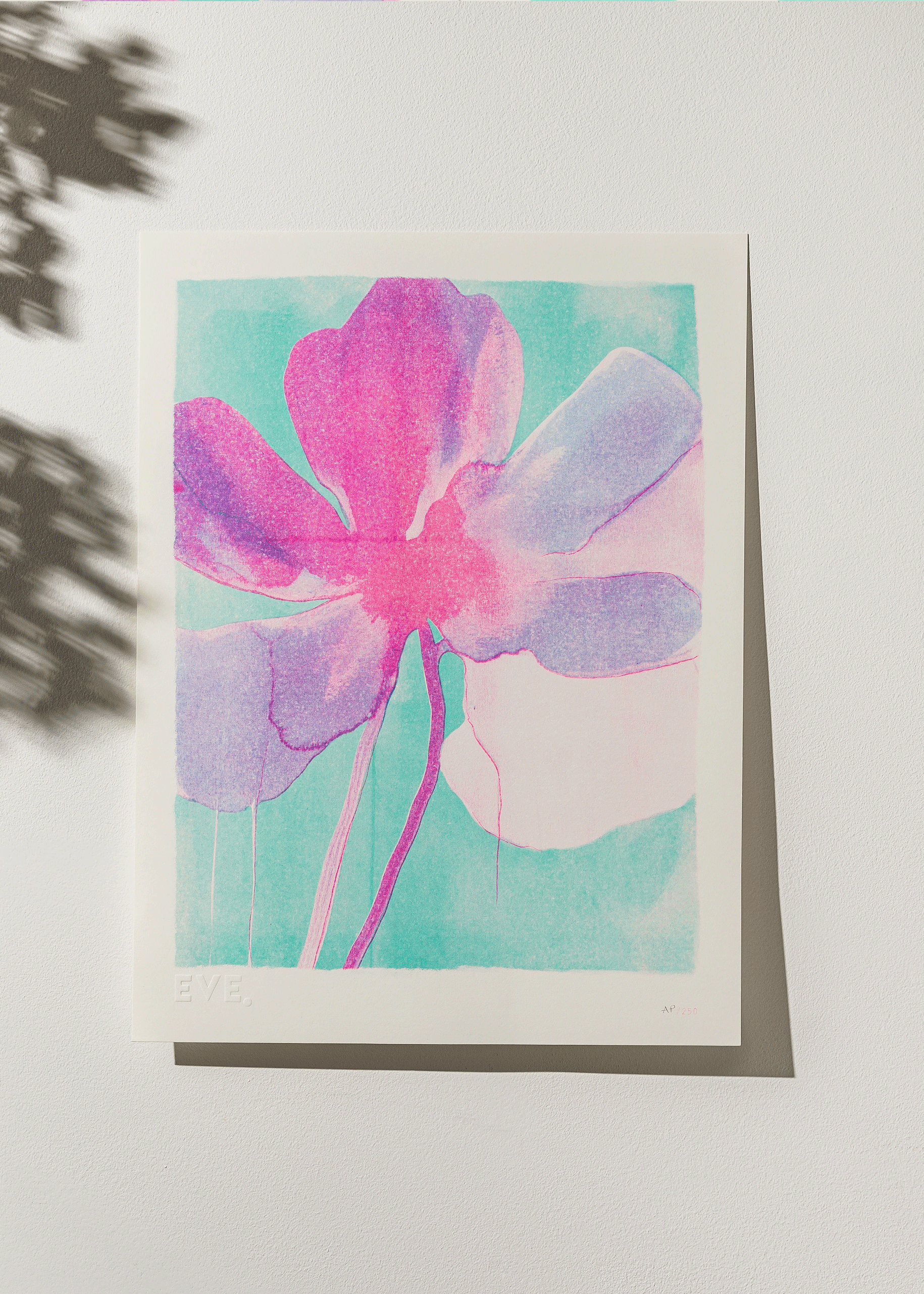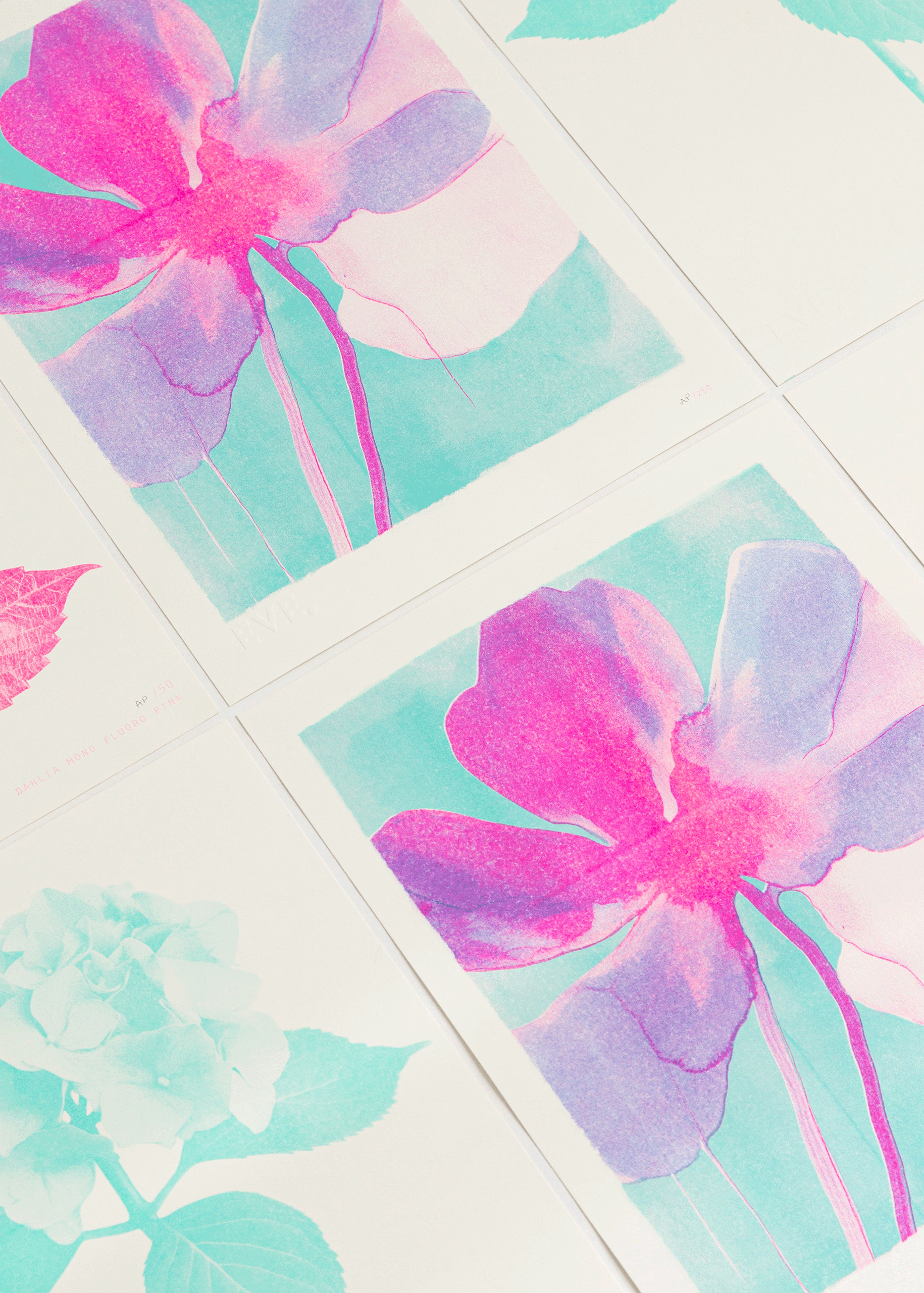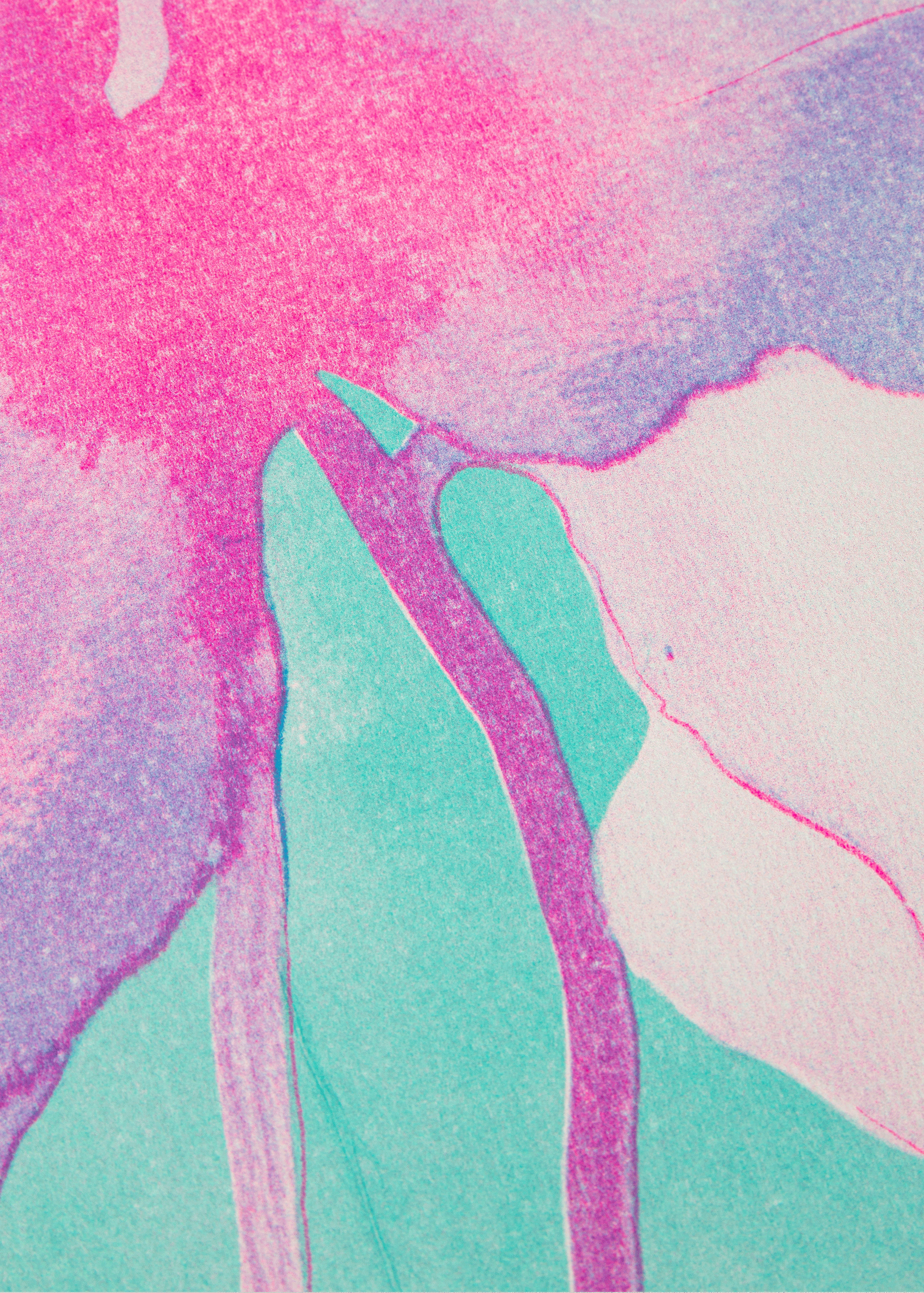Drippy Flower Risograph Print in fluoro pink, mint, and cornflower blue ink.