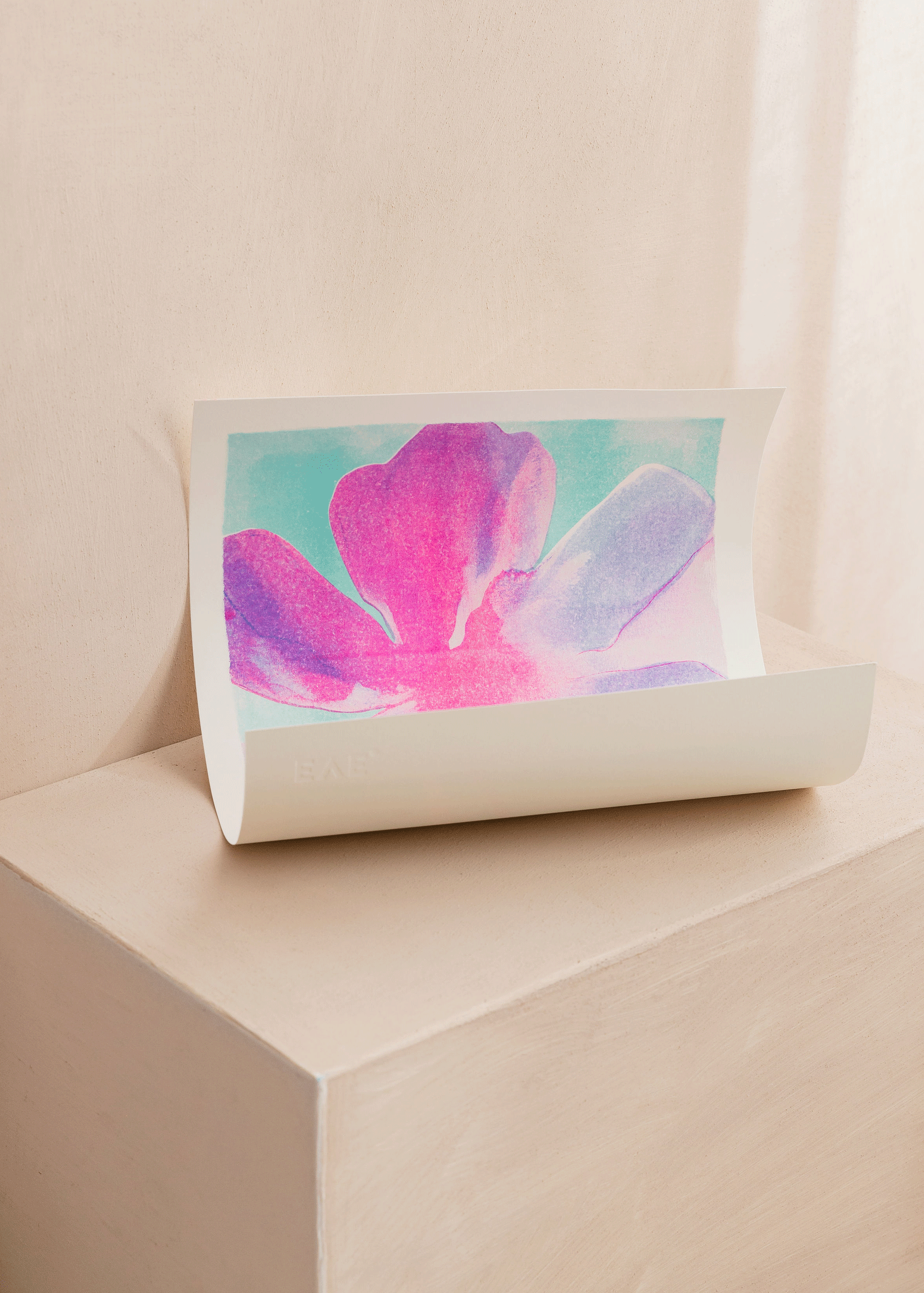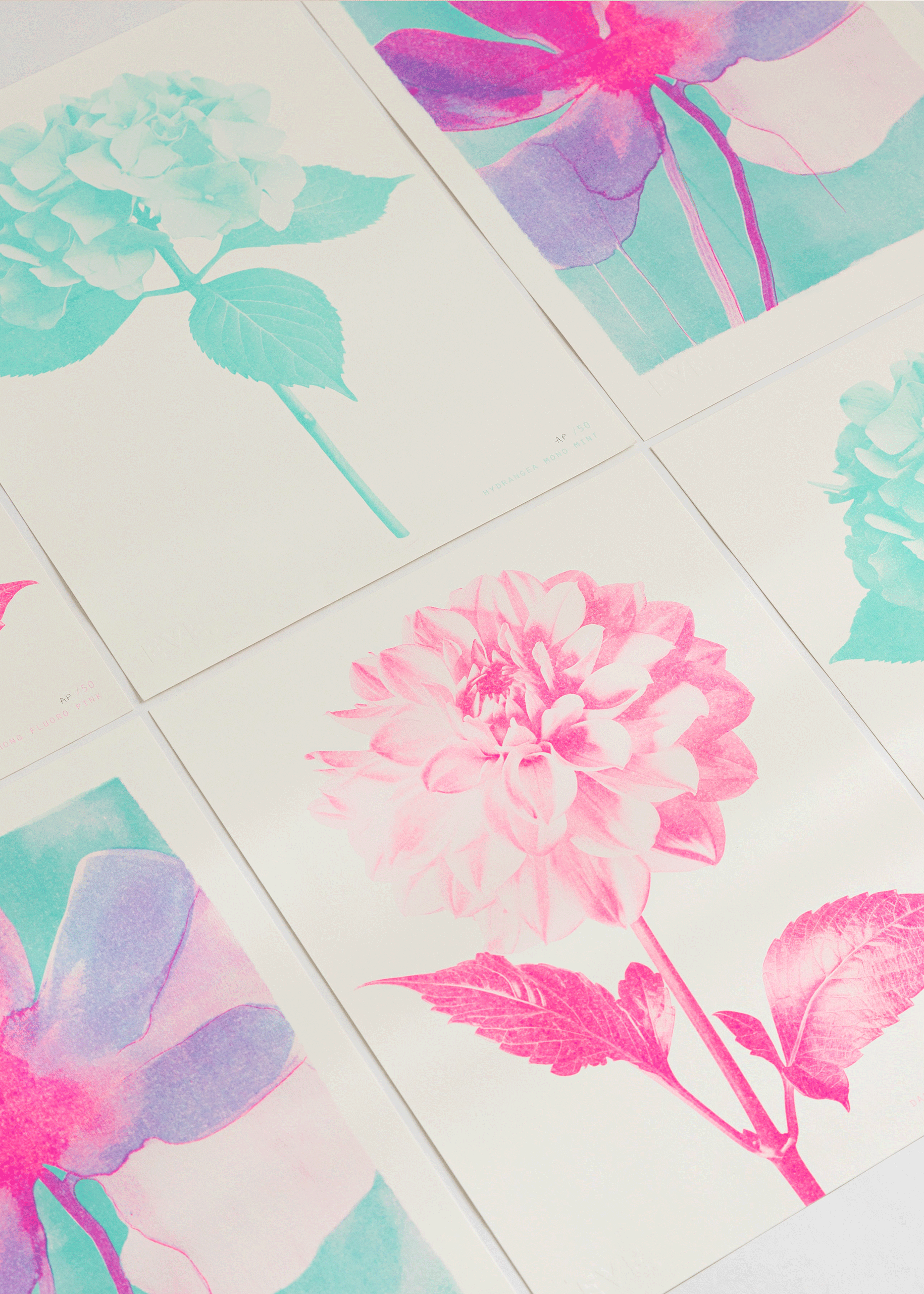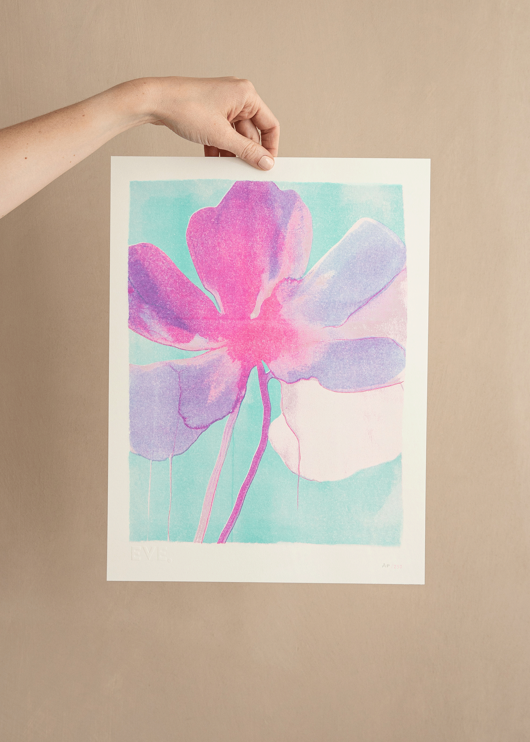 Drippy Flower Risograph Print in fluoro pink, mint, and cornflower blue ink.