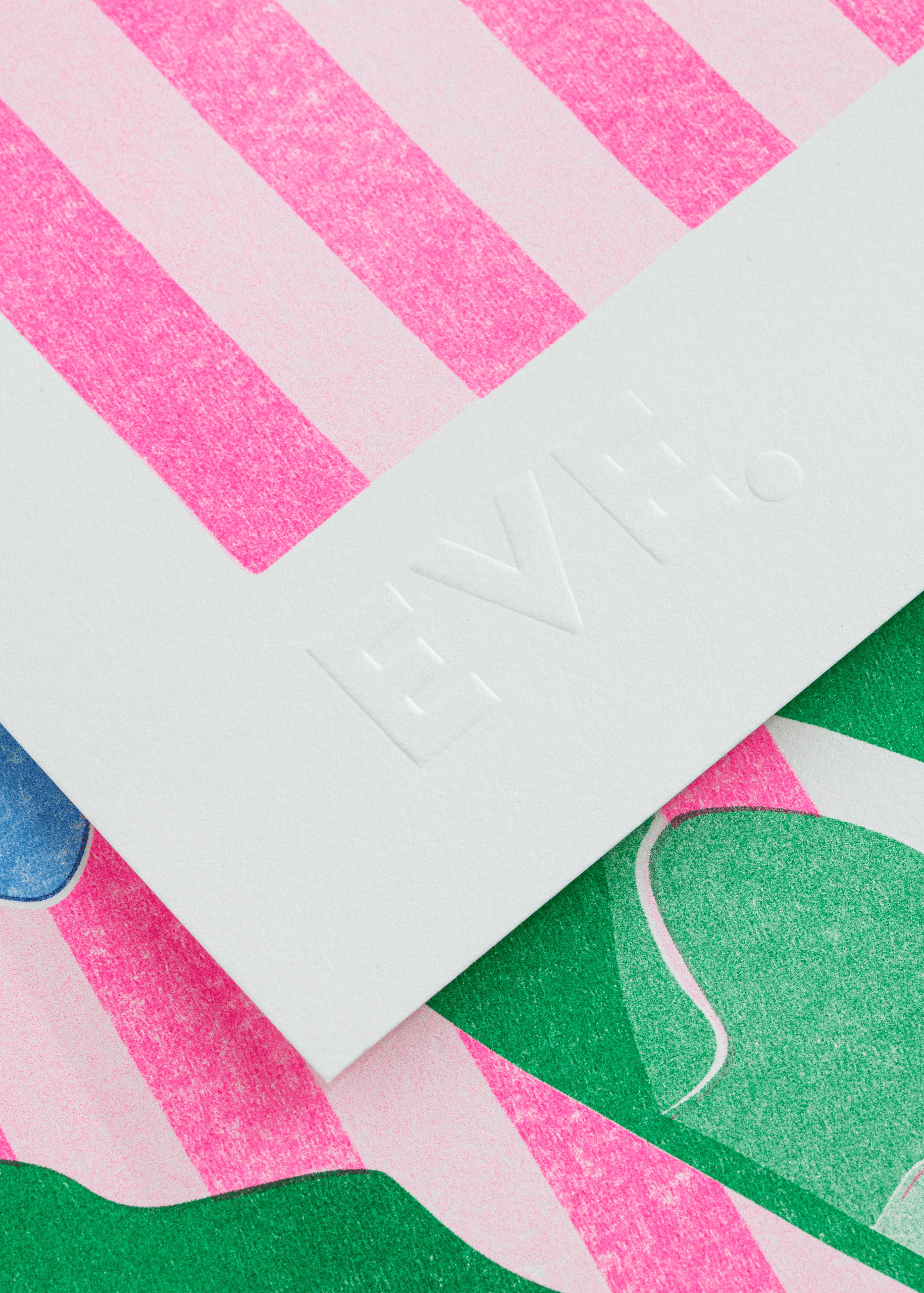 Blind embossed with the Eve. logo and numbered by hand in pencil