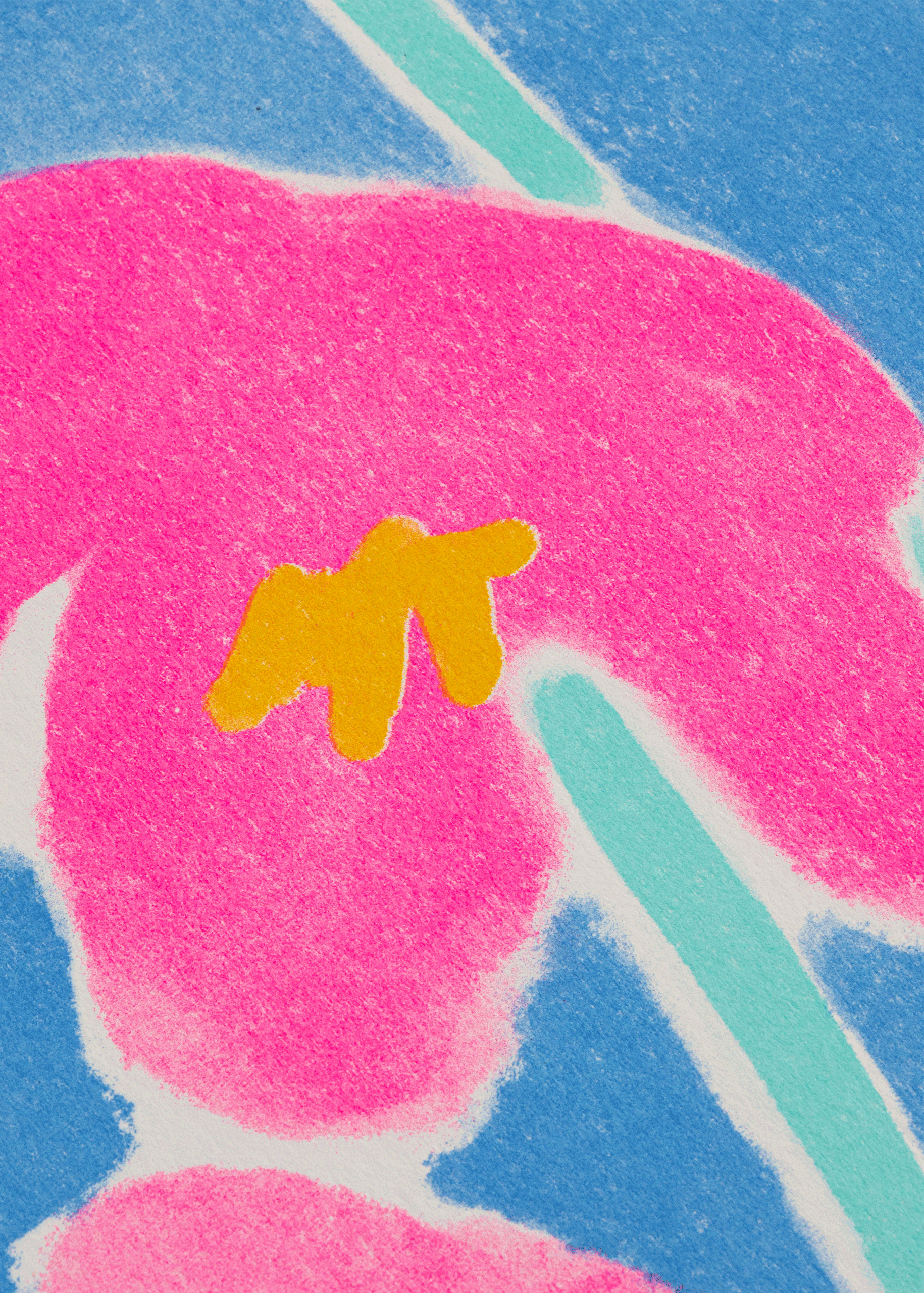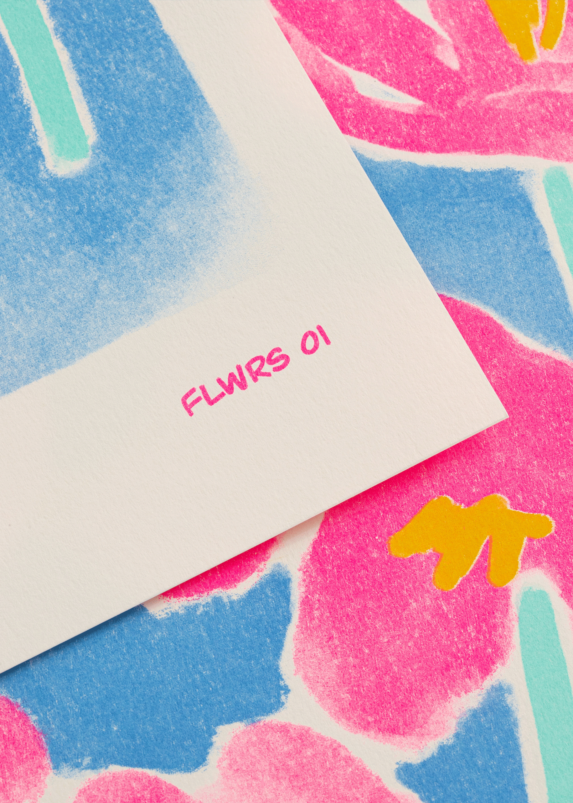 FLWRS 01 is a Risograph Print in fluoro pink, sunflower, cornflower blue and mint ink.