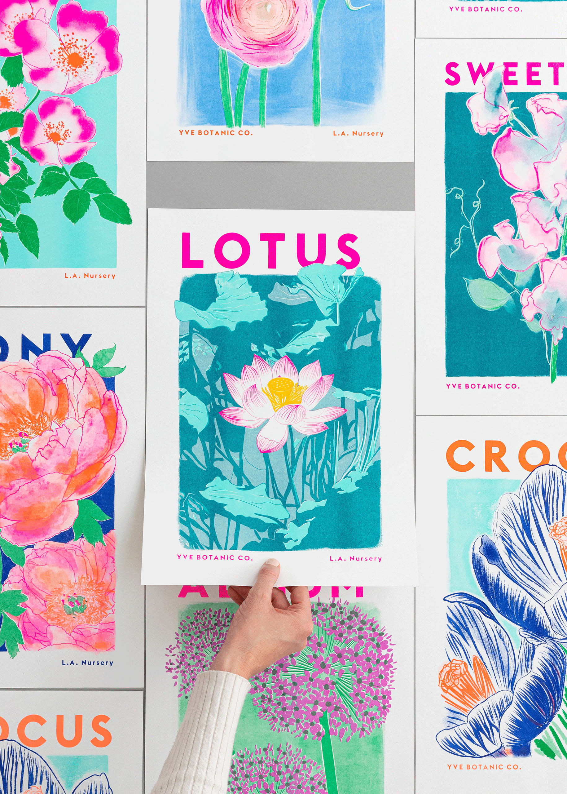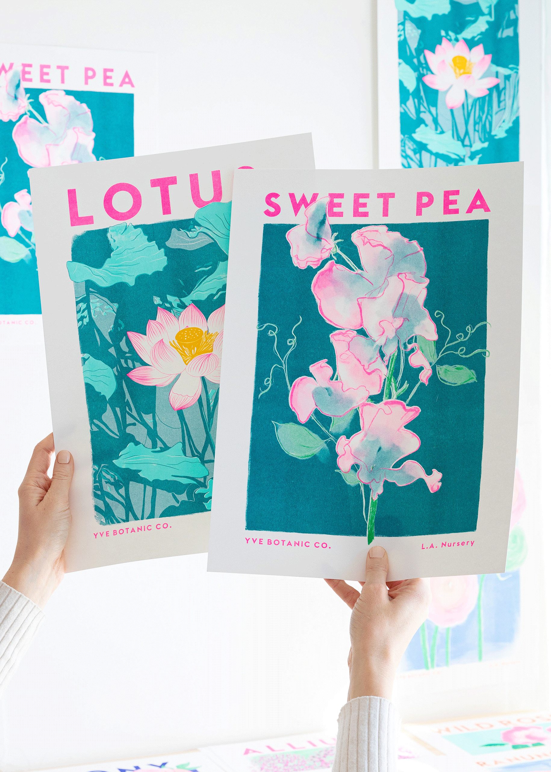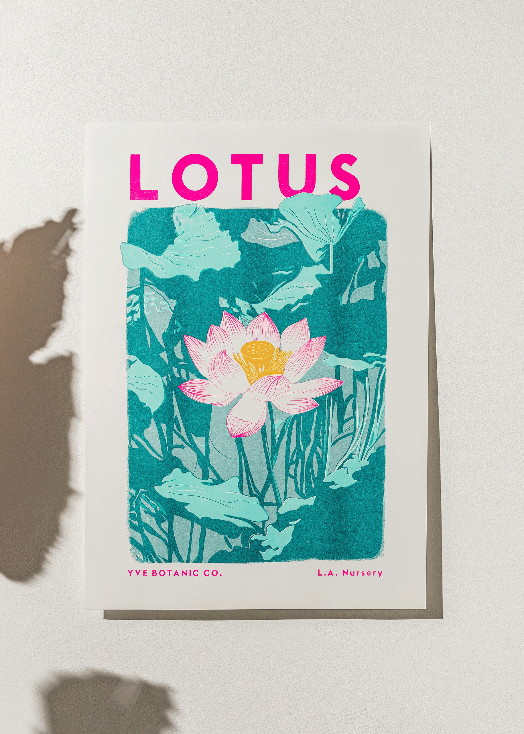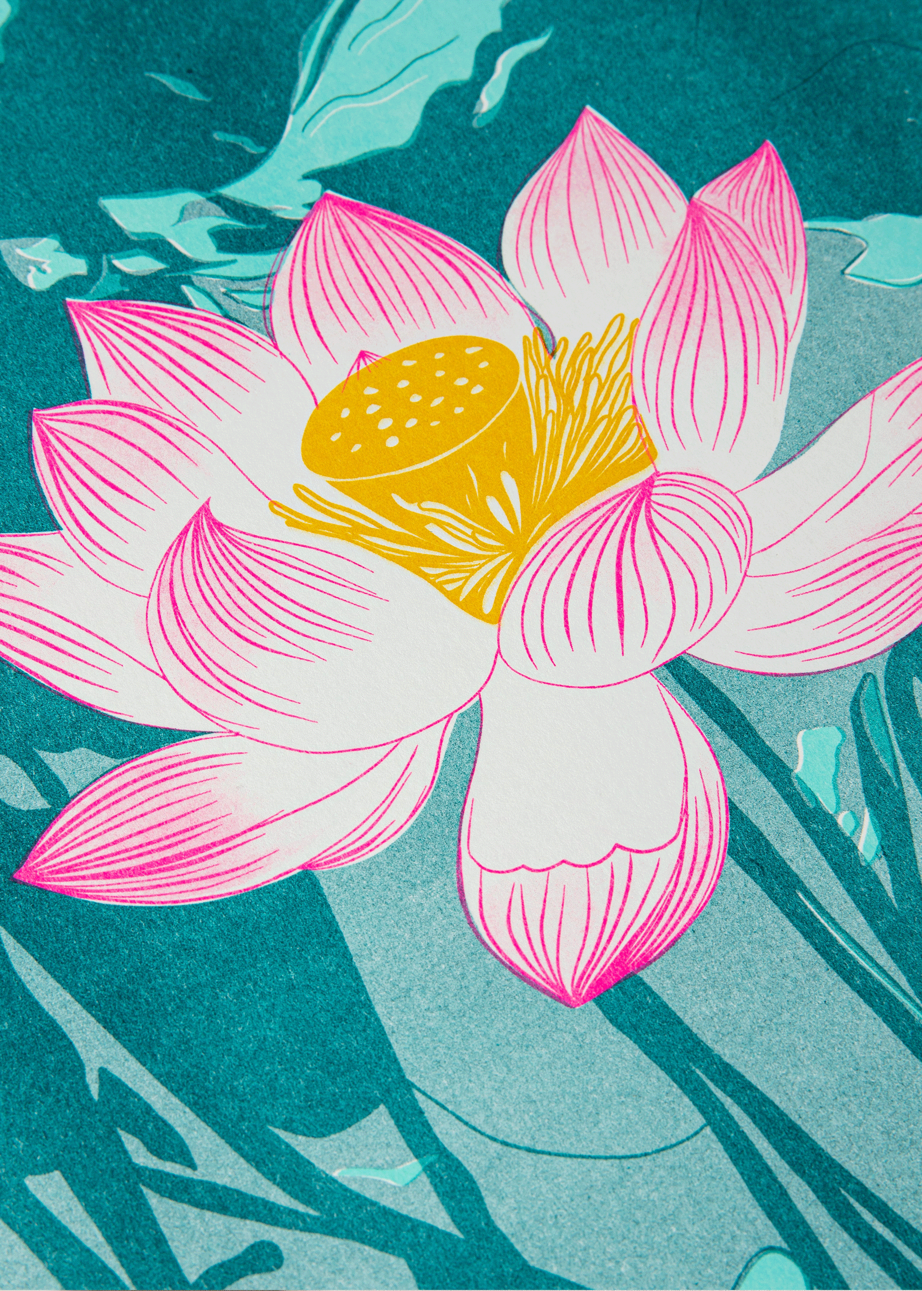 Our Lotus Flower Riso print in fluoro pink, teal, mint and sunflower yellow.