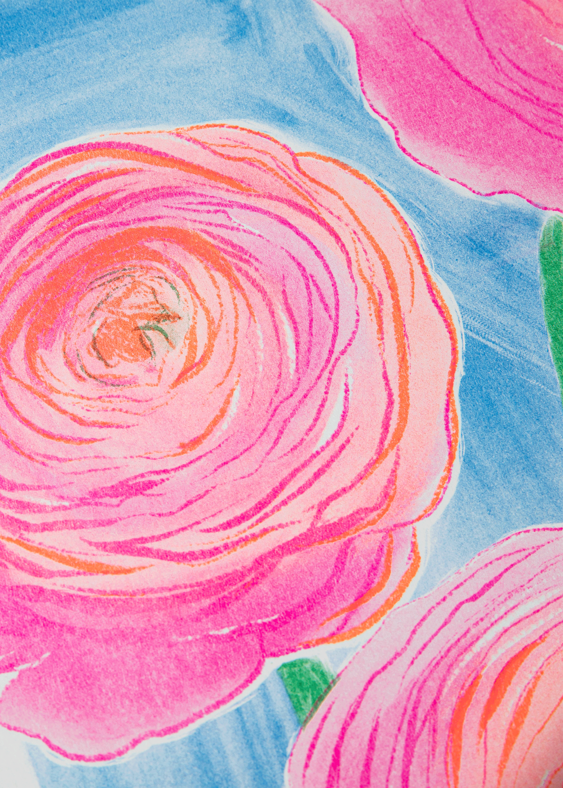 Our Ranunculus Risograph print uses fluoro pink, fluoro orange, cornflower blue and green plant based ink.