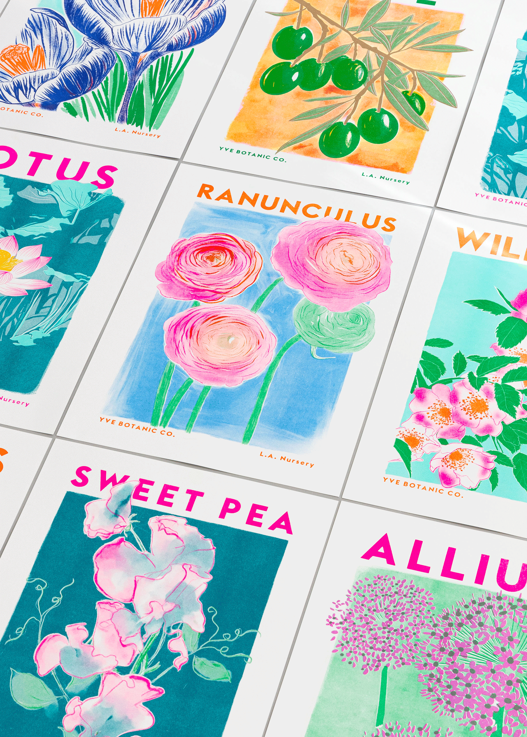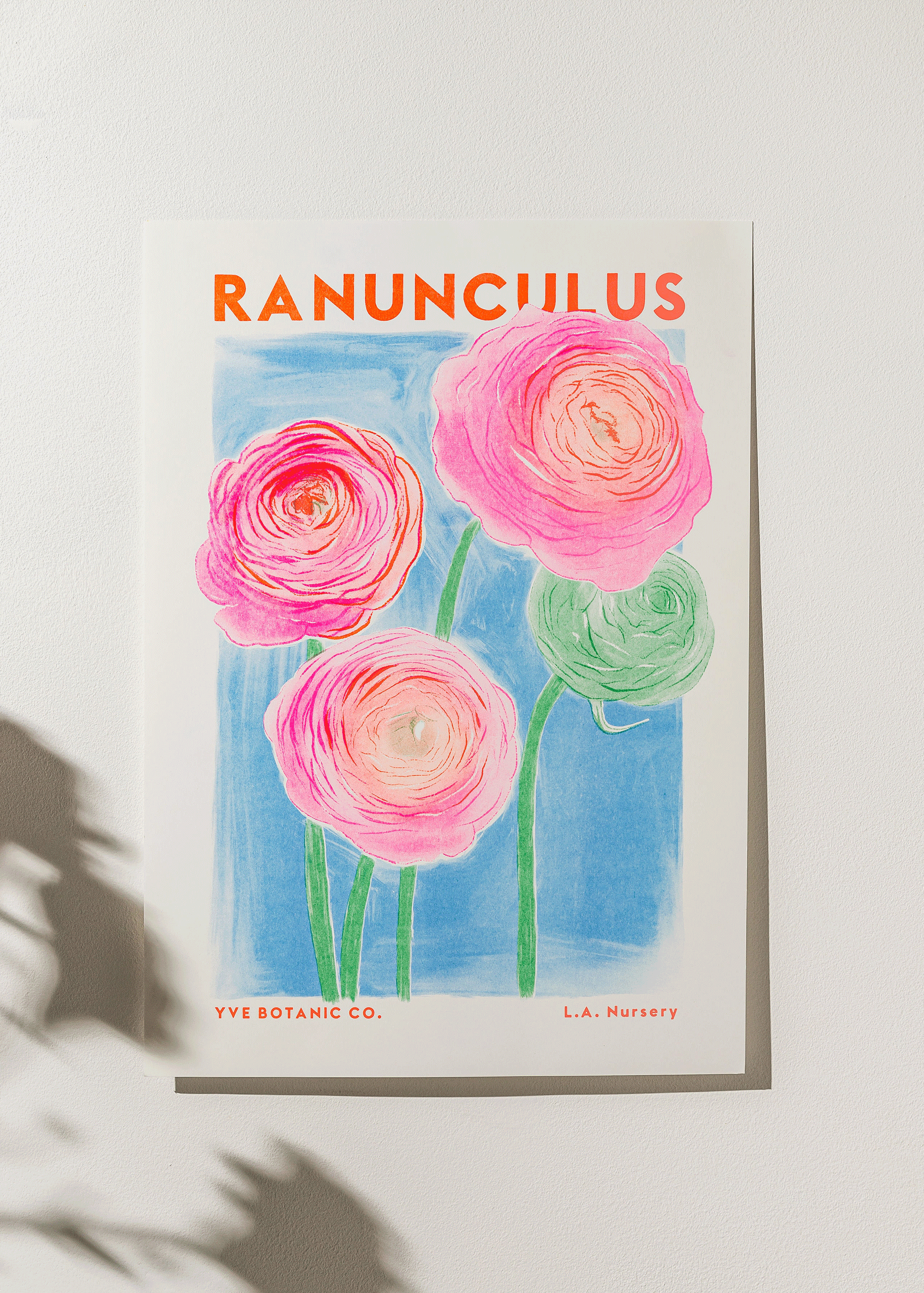 Part of the Buttercup family, the Ranunculus flower enjoys tightly packed layered petals. This riso print is part of our L.A. Nursery collection.