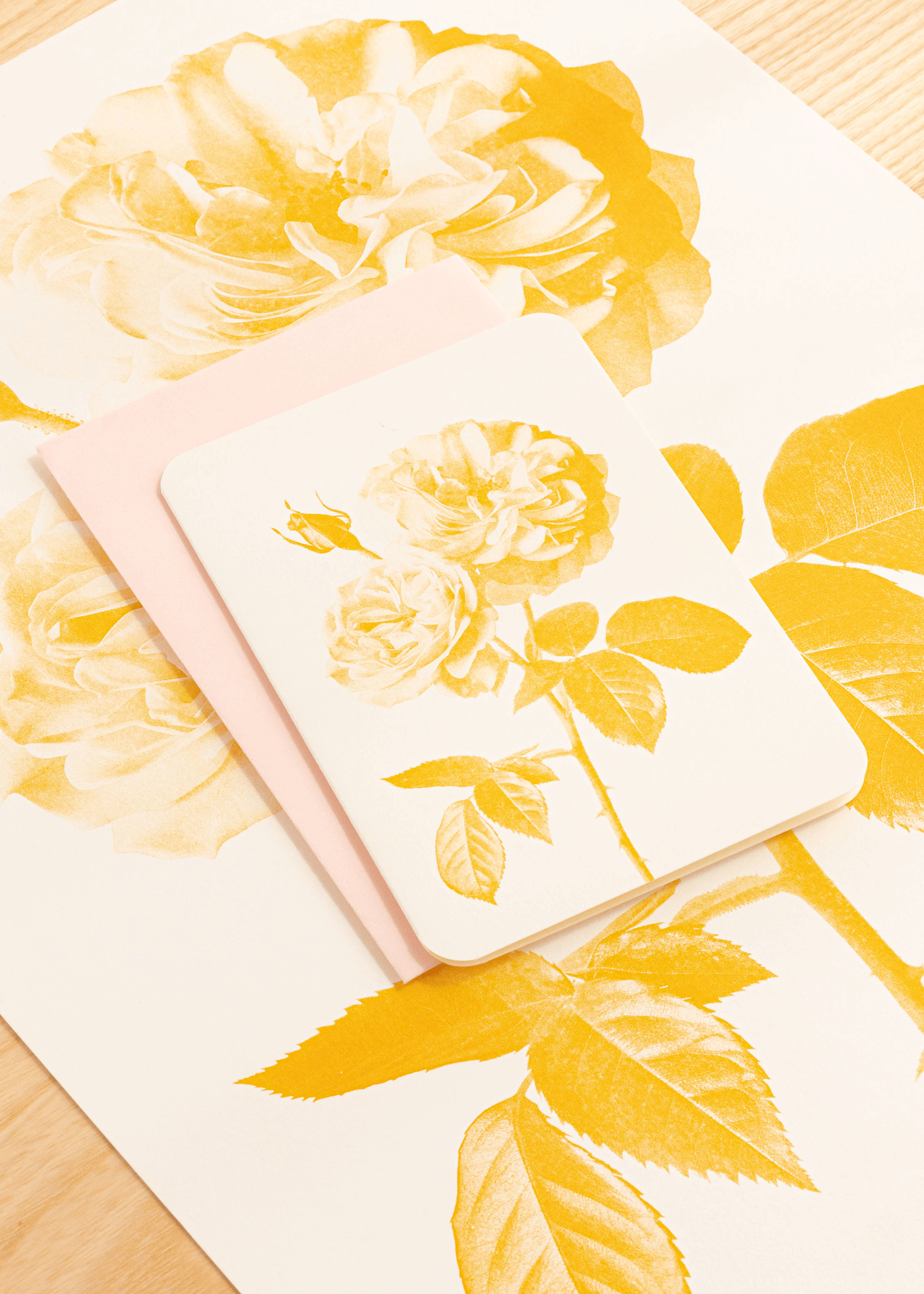This simple botanical card features Roses on a single stem in sunflower yellow plant based ink. The card has been Risograph printed and finished with rounded corners.