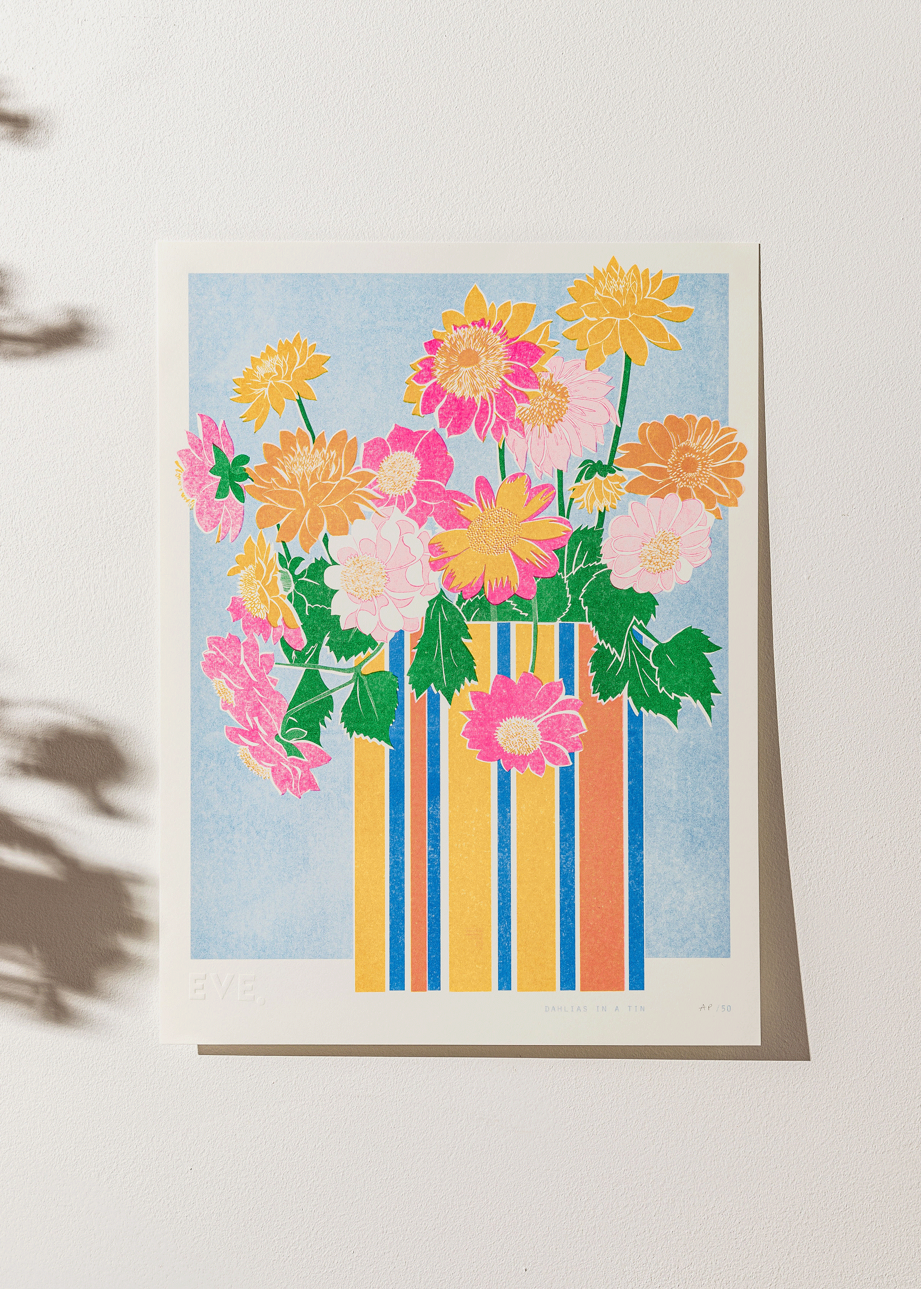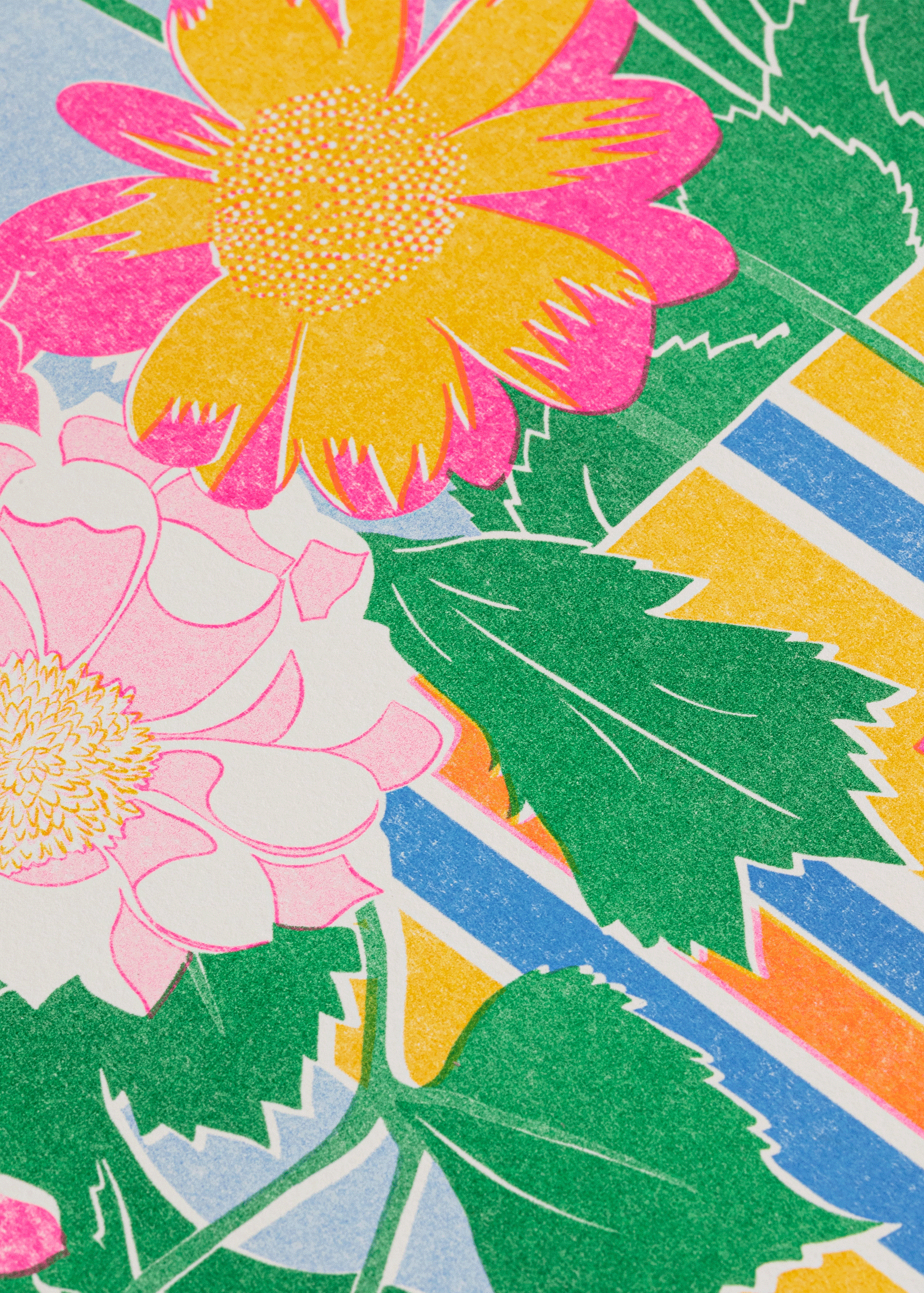 Dahlias in a Tin is a Risograph Print in fluoro pink, sunflower yellow, green and cornflower blue ink.